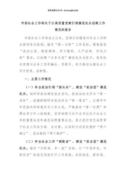 【七哥公文】2024年:市委社会工作部关于以高质量党建引领模范机关创建工作情况的报告+更多免费公文+VX:QiGeGongWen2024
