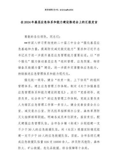 【七哥公文】2024年:在2024年基层应急体系和能力建设推进会上的汇报发言+更多免费公文+VX:QiGeGongWen2024