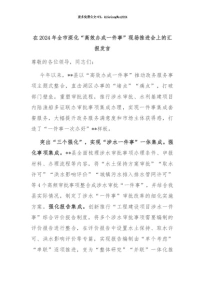 【七哥公文】2024年:在2024年全市深化“高效办成一件事”现场推进会上的汇报发言+更多免费公文+VX:QiGeGongWen2024