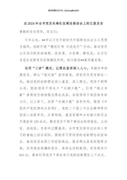【七哥公文】2024年:在2024年全市党员先锋队伍建设推进会上的汇报发言+更多免费公文+VX:QiGeGongWen2024