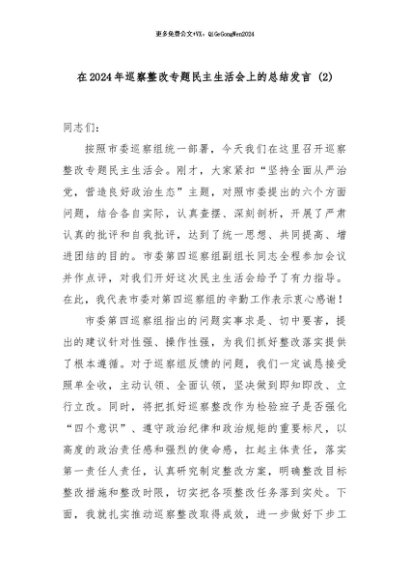【七哥公文】2024年:在2024年巡察整改专题民主生活会上的总结发言 (2)+更多免费公文+VX:QiGeGongWen2024