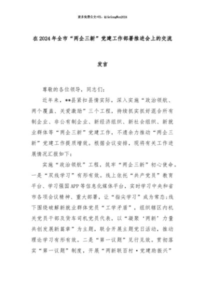 【七哥公文】2024年:在2024年全市“两企三新”党建工作部署推进会上的交流发言+更多免费公文+VX:QiGeGongWen2024
