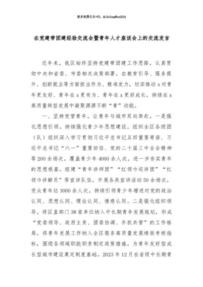 【七哥公文】2024年:在党建带团建经验交流会暨青年人才座谈会上的交流发言+更多免费公文+VX:QiGeGongWen2024