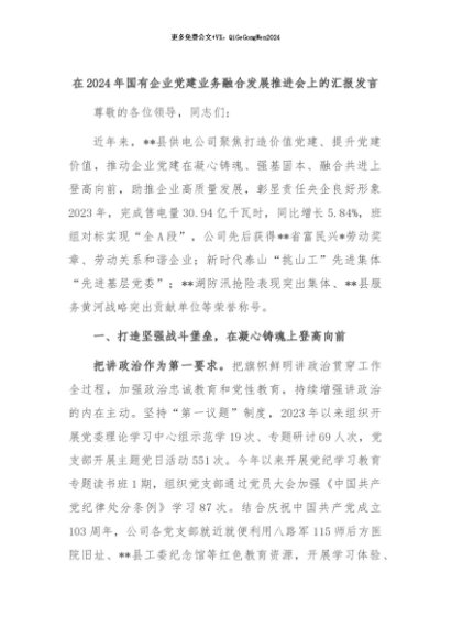 【七哥公文】2024年:在2024年国有企业党建业务融合发展推进会上的汇报发言+更多免费公文+VX:QiGeGongWen2024