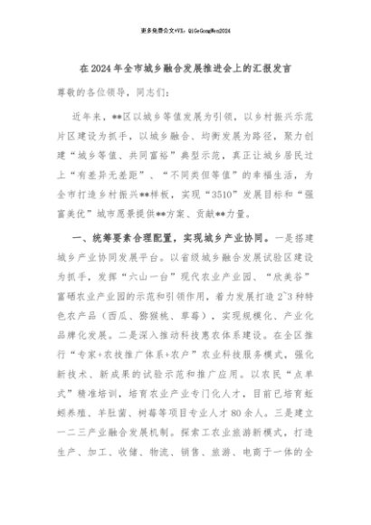 / 【七哥公文】2024年:在2024年全市城乡融合发展推进会上的汇报发言+更多免费公文+VX:QiGeGongWen2024