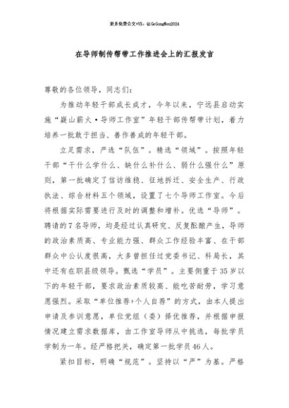 / 【七哥公文】2024年:在导师制传帮带工作推进会上的汇报发言+更多免费公文+VX:QiGeGongWen2024