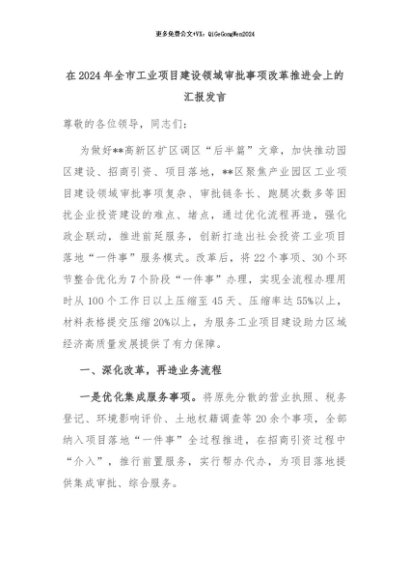 【七哥公文】2024年:在2024年全市工业项目建设领域审批事项改革推进会上的汇报发言+更多免费公文+VX:QiGeGongWen2024