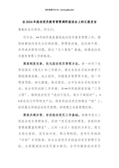 【七哥公文】2024年:在2024年流动党员教育管理调研座谈会上的汇报发言+更多免费公文+VX:QiGeGongWen2024