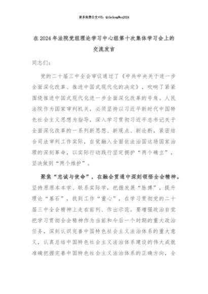 【七哥公文】2024年:在2024年法院党组理论学习中心组第十次集体学习会上的交流发言+更多免费公文+VX:QiGeGongWen2024