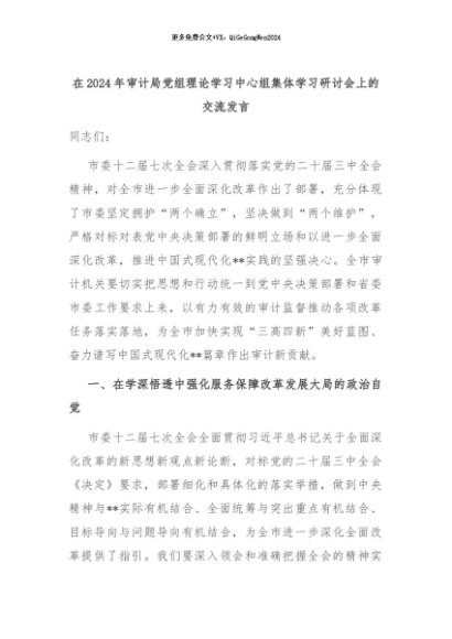 【七哥公文】2024年:在2024年审计局党组理论学习中心组集体学习研讨会上的交流发言+更多免费公文+VX:QiGeGongWen2024