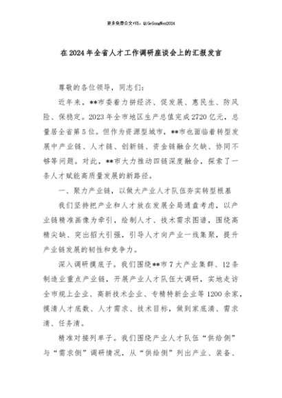 / 【七哥公文】2024年:在2024年全省人才工作调研座谈会上的汇报发言+更多免费公文+VX:QiGeGongWen2024