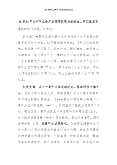 【七哥公文】2024年:在2024年全市农业全产业链建设现场推进会上的汇报发言+更多免费公文+VX:QiGeGongWen2024