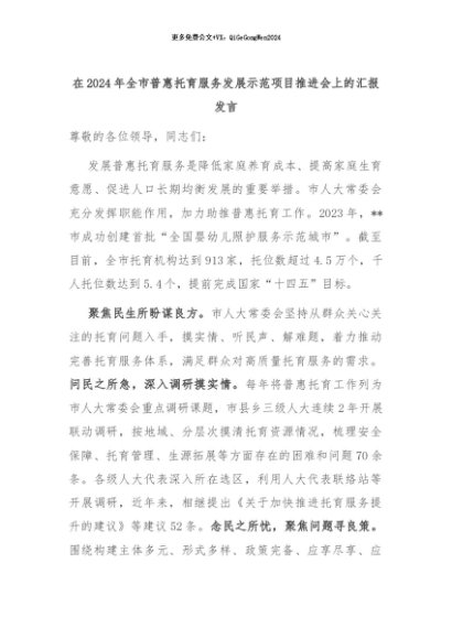【七哥公文】2024年:在2024年全市普惠托育服务发展示范项目推进会上的汇报发言+更多免费公文+VX:QiGeGongWen2024