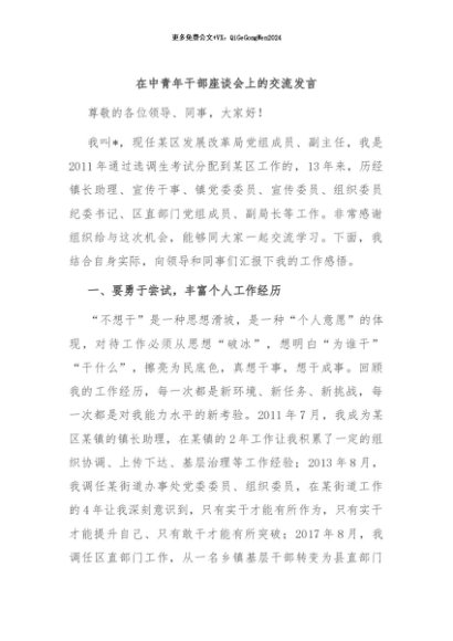 / 【七哥公文】2024年:在中青年干部座谈会上的交流发言 (1)+更多免费公文+VX:QiGeGongWen2024
