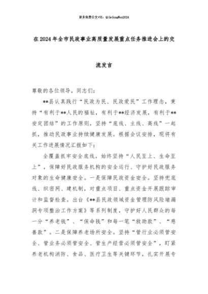 【七哥公文】2024年:在2024年全市民政事业高质量发展重点任务推进会上的交流发言+更多免费公文+VX:QiGeGongWen2024