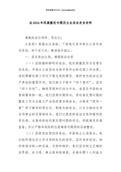 / 【七哥公文】2024年:在2024年巡察整改专题民主生活会发言材料+更多免费公文+VX:QiGeGongWen2024