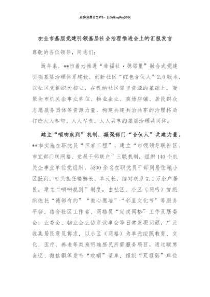 / 【七哥公文】2024年:在全市基层党建引领基层社会治理推进会上的汇报发言+更多免费公文+VX:QiGeGongWen2024