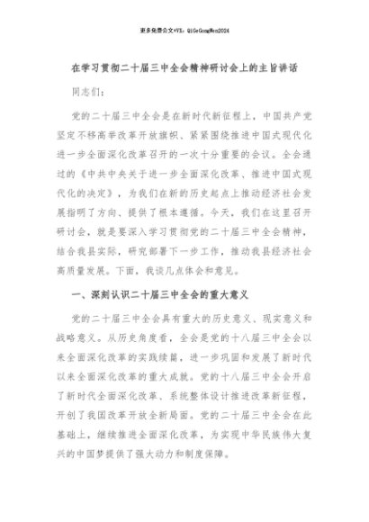 / 【七哥公文】2024年:在学习贯彻二十届三中全会精神研讨会上的主旨讲话+更多免费公文+VX:QiGeGongWen2024