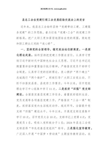 / 【七哥公文】2024年:县总工会在党建引领工会发展经验交流会上的发言+更多免费公文+VX:QiGeGongWen2024