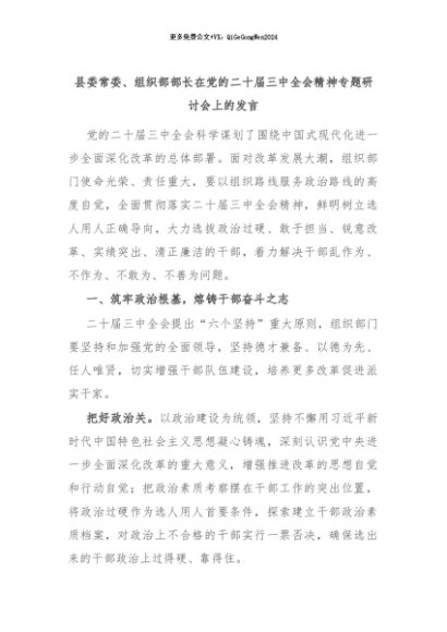 【七哥公文】2024年:县委常委、组织部部长在党的二十届三中全会精神专题研讨会上的发言+更多免费公文+VX:QiGeGongWen2024