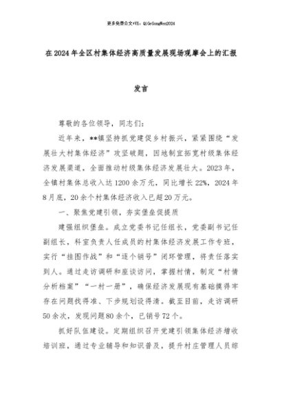 【七哥公文】2024年:在2024年全区村集体经济高质量发展现场观摩会上的汇报发言+更多免费公文+VX:QiGeGongWen2024