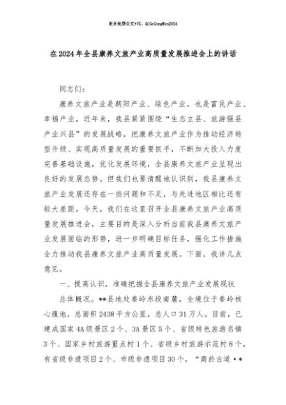 【七哥公文】2024年:在2024年全县康养文旅产业高质量发展推进会上的讲话+更多免费公文+VX:QiGeGongWen2024
