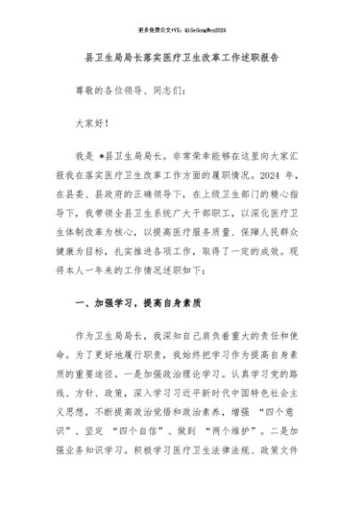 / 【七哥公文】2024年:县卫生局局长落实医疗卫生改革工作述职报告+更多免费公文+VX:QiGeGongWen2024