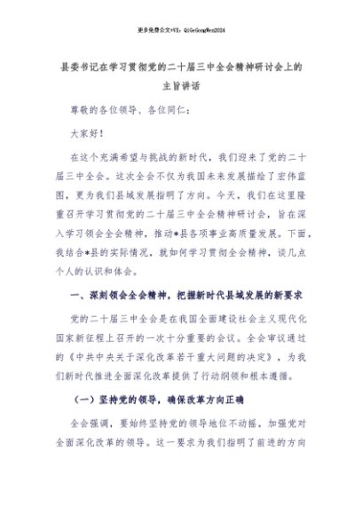 【七哥公文】2024年:县委书记在学习贯彻党的二十届三中全会精神研讨会上的主旨讲话+更多免费公文+VX:QiGeGongWen2024