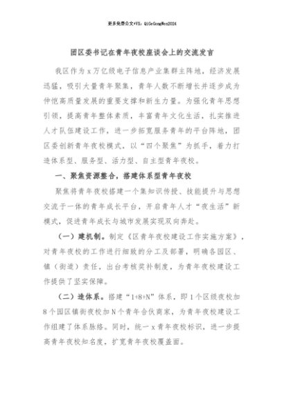 / 【七哥公文】2024年:团区委书记在青年夜校座谈会上的交流发言+更多免费公文+VX:QiGeGongWen2024