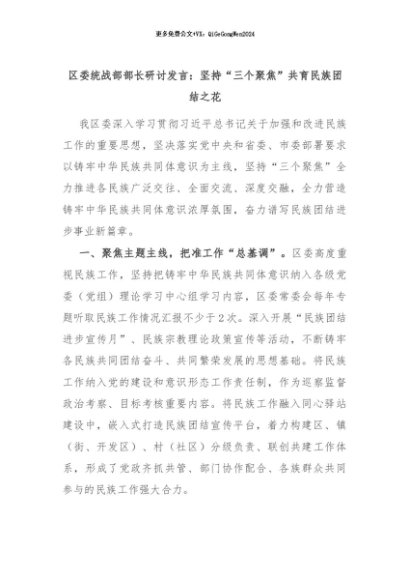 【七哥公文】2024年:区委统战部部长研讨发言:坚持“三个聚焦”共育民族团结之花+更多免费公文+VX:QiGeGongWen2024