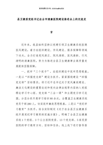 【七哥公文】2024年:县卫健委党组书记在全市清廉医院建设推进会上的交流发言+更多免费公文+VX:QiGeGongWen2024