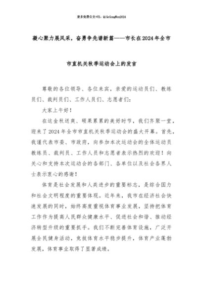 【七哥公文】2024年:凝心聚力展风采,奋勇争先谱新篇——市长在2024年全市市直机关秋季运动会上的发言+更多免费公文+VX:QiGeGongWen2024