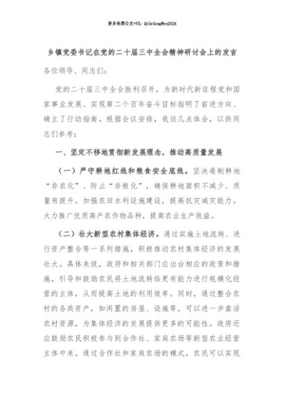【七哥公文】2024年:乡镇党委书记在党的二十届三中全会精神研讨会上的发言+更多免费公文+VX:QiGeGongWen2024