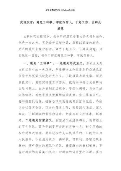 【七哥公文】2024年:交流发言:避免五种事、学做四种人,干好工作、让群众满意 (1)+更多免费公文+VX:QiGeGongWen2024