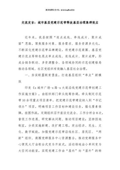 / 【七哥公文】2024年:交流发言:城市基层党建示范带释放基层治理集群效应+更多免费公文+VX:QiGeGongWen2024