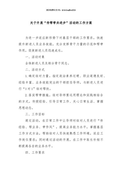 / 【七哥公文】2024年:关于开展“传帮带共进步”活动的工作方案+更多免费公文+VX:QiGeGongWen2024