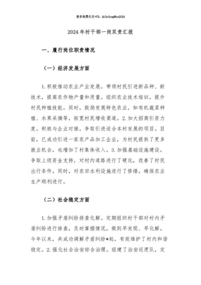 / 【七哥公文】2024年:2024年村干部一岗双责汇报+更多免费公文+VX:QiGeGongWen2024