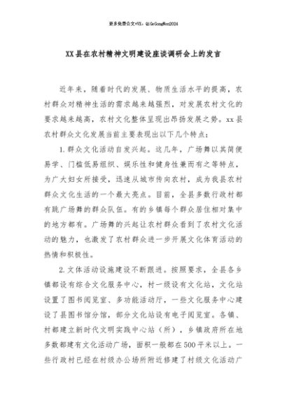 / 【七哥公文】2024年:XX县在农村精神文明建设座谈调研会上的发言+更多免费公文+VX:QiGeGongWen2024