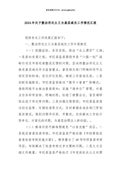 / 【七哥公文】2024年:2024年关于整治形式主义为基层减负工作情况汇报+更多免费公文+VX:QiGeGongWen2024