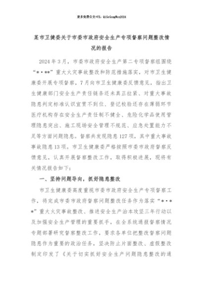【七哥公文】2024年:某市卫健委关于市委市政府安全生产专项督察问题整改情况的报告+更多免费公文+VX:QiGeGongWen2024