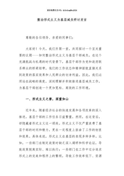/ 【七哥公文】2024年:整治形式主义为基层减负研讨发言+更多免费公文+VX:QiGeGongWen2024