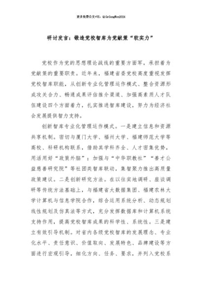 / 【七哥公文】2024年:研讨发言:锻造党校智库为党献策“软实力”+更多免费公文+VX:QiGeGongWen2024