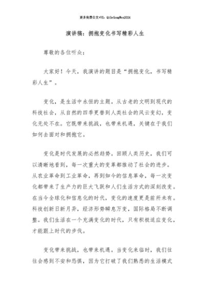 【七哥公文】2024年:演讲稿:拥抱变化书写精彩人生+更多免费公文+VX:QiGeGongWen2024