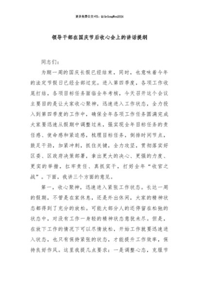 【七哥公文】2024年:领导干部在国庆节后收心会上的讲话提纲+更多免费公文+VX:QiGeGongWen2024