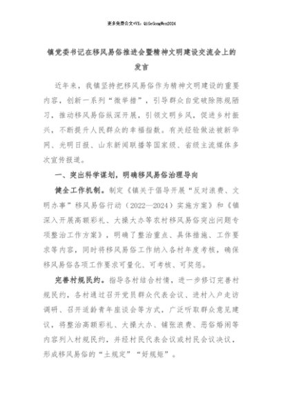 【七哥公文】2024年:镇党委书记在移风易俗推进会暨精神文明建设交流会上的发言+更多免费公文+VX:QiGeGongWen2024