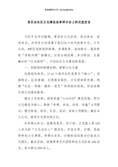 / 【七哥公文】2024年:某区在社区文化建设改革研讨会上的交流发言+更多免费公文+VX:QiGeGongWen2024