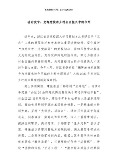 / 【七哥公文】2024年:研讨发言:发挥党校在乡村全面振兴中的作用+更多免费公文+VX:QiGeGongWen2024
