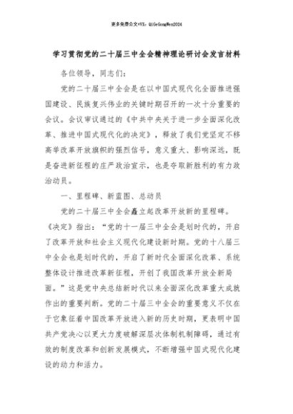 / 【七哥公文】2024年:学习贯彻党的二十届三中全会精神理论研讨会发言材料+更多免费公文+VX:QiGeGongWen2024