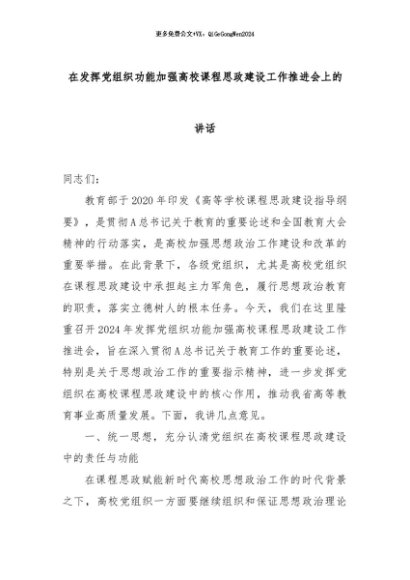 【七哥公文】2024年:在发挥党组织功能加强高校课程思政建设工作推进会上的讲话+更多免费公文+VX:QiGeGongWen2024