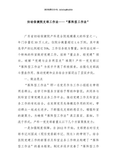 / 【七哥公文】2024年:妇幼保健院支部工作法——“雁阵型工作法”+更多免费公文+VX:QiGeGongWen2024